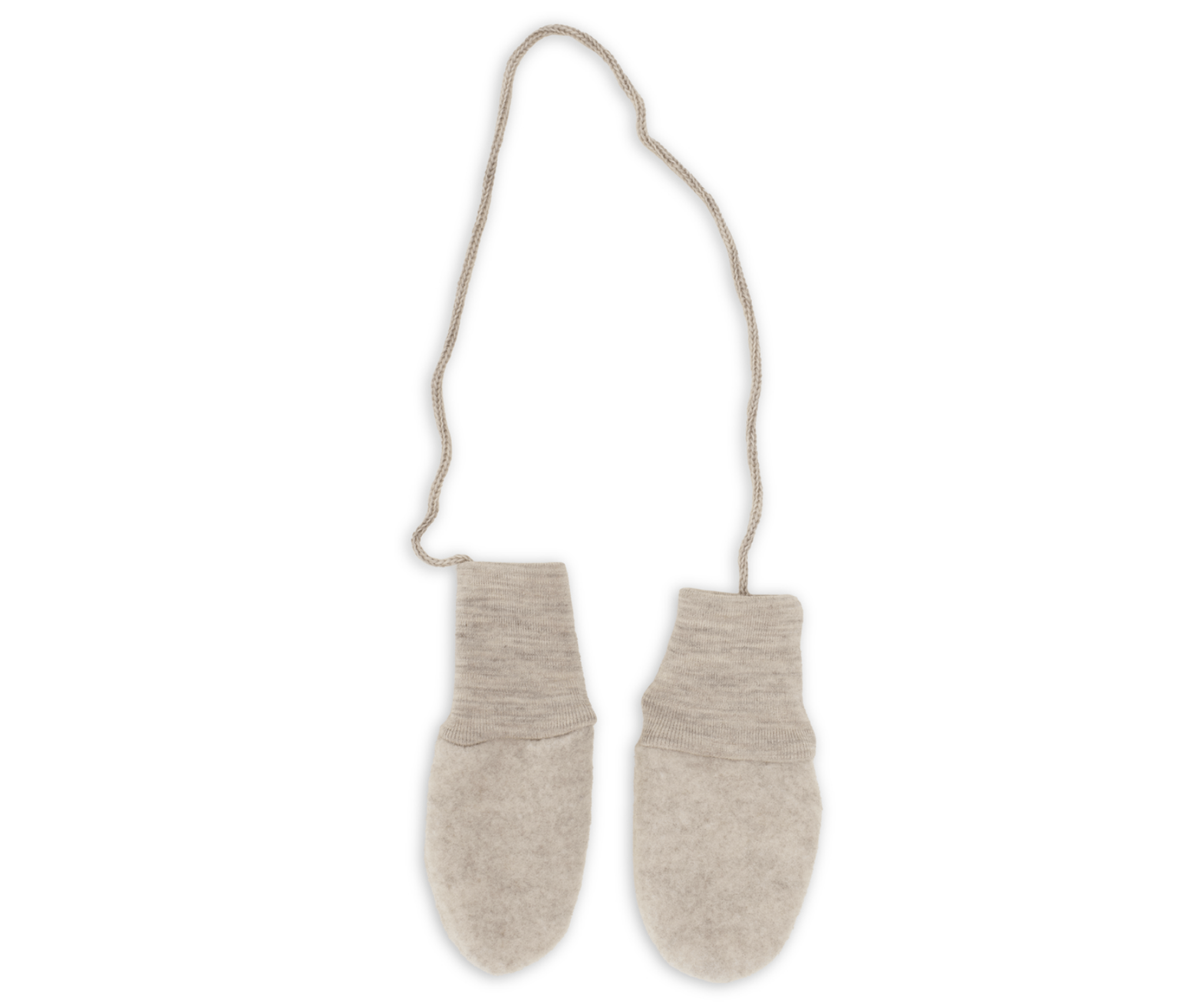 Mjuka sköna babyvantar utan tumme i renaste IVN-certifierade merinoull som håller bebisens händer varma och torra. Snöret håller vantarna på plats.