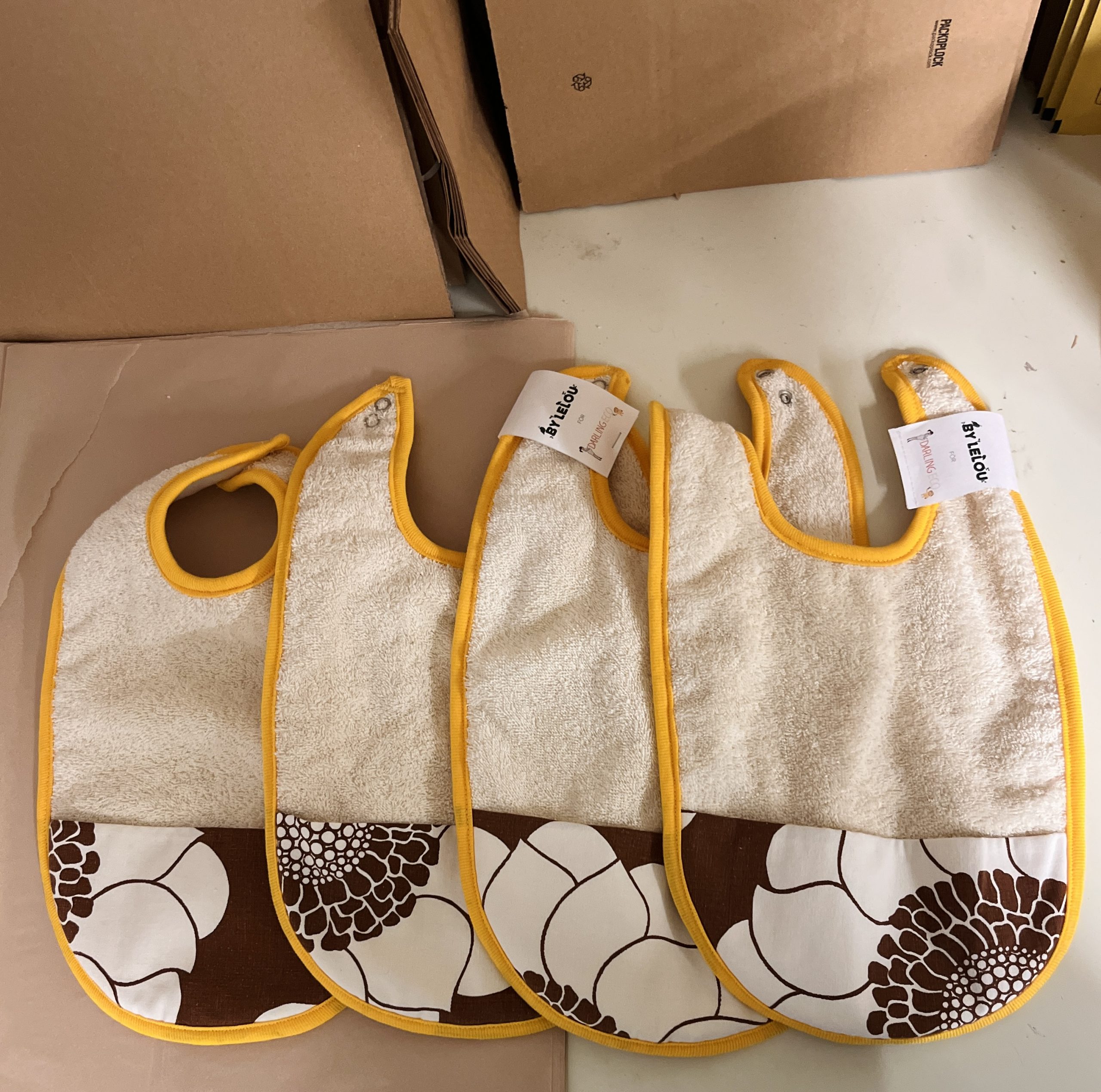 Darling Ecos egendesignade haklapp i samarbete med By Lelou! Unik i sitt utförande. Extra bred och lång haklapp som skyddar kläderna från spill och kladd. Frottén framtill fångar upp kladdig och flytande mat medan större matbitar rullar ner och samlas i den utåtvinklade uppsamlingsfickan. Den ekologiska bomullsfleecen på baksidan gör att fukten inte går igenom och frottén framtill har fenomenal uppsugningsförmåga. Knäpps i nacken med tryckknappar i två olika lägen. Formgiven av Darling Eco i samarbete med By Lelou. Varje haklapp är unik och är uppsydd för hand hos By Lelou.
